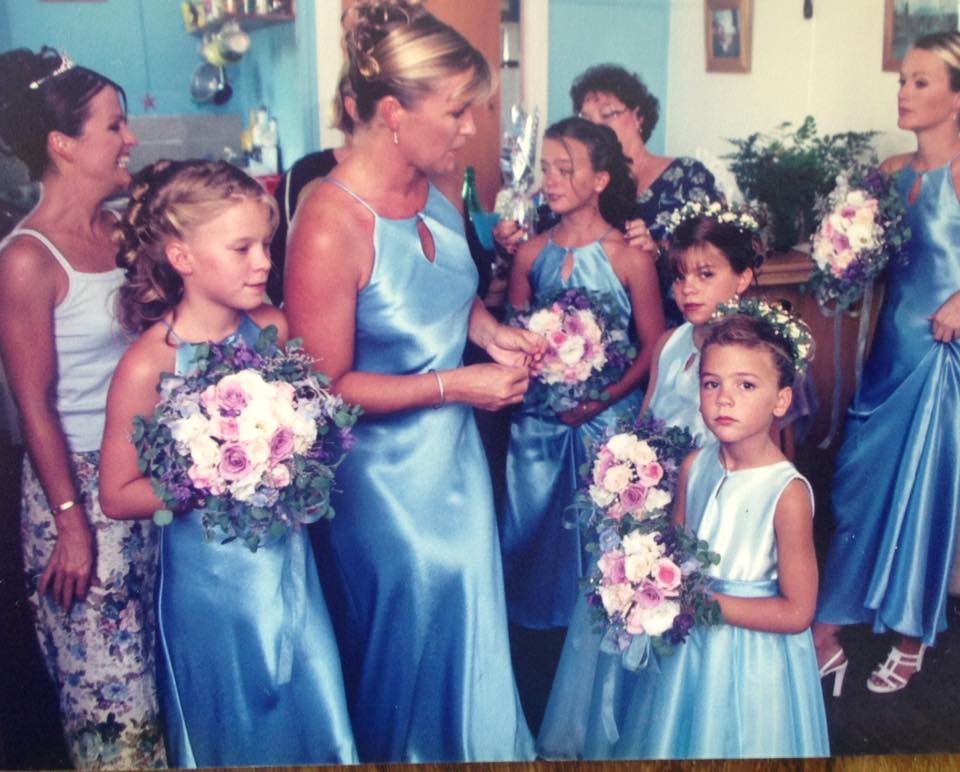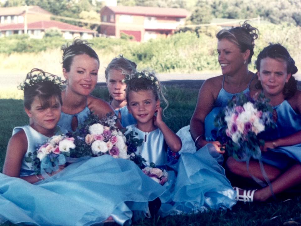 Our two little flower girls, Jordi and Tori, stepped carefully out of the car, clutching their rainbow-coloured summer posies as if their lives depended on it. Dressed in sky-blue satin, tulle, and silk organza, they took their role very seriously and looked every bit the little angels they were. White rosebud circlets crowned their sweetly swished hair, as perfect as any halo. I heard a collective sigh from the crowd as each of the six girls emerged from the cars, one by one. Our older nieces, Kahli and Teagan—big sisters to the flower girls, served as junior bridesmaids, while Sue and Deb were our senior bridesmaids. All four wore sky-blue sheath dresses made of fabric so fluid it looked like water, each of them radiant with smiles as bright as the sun that blessed our day.